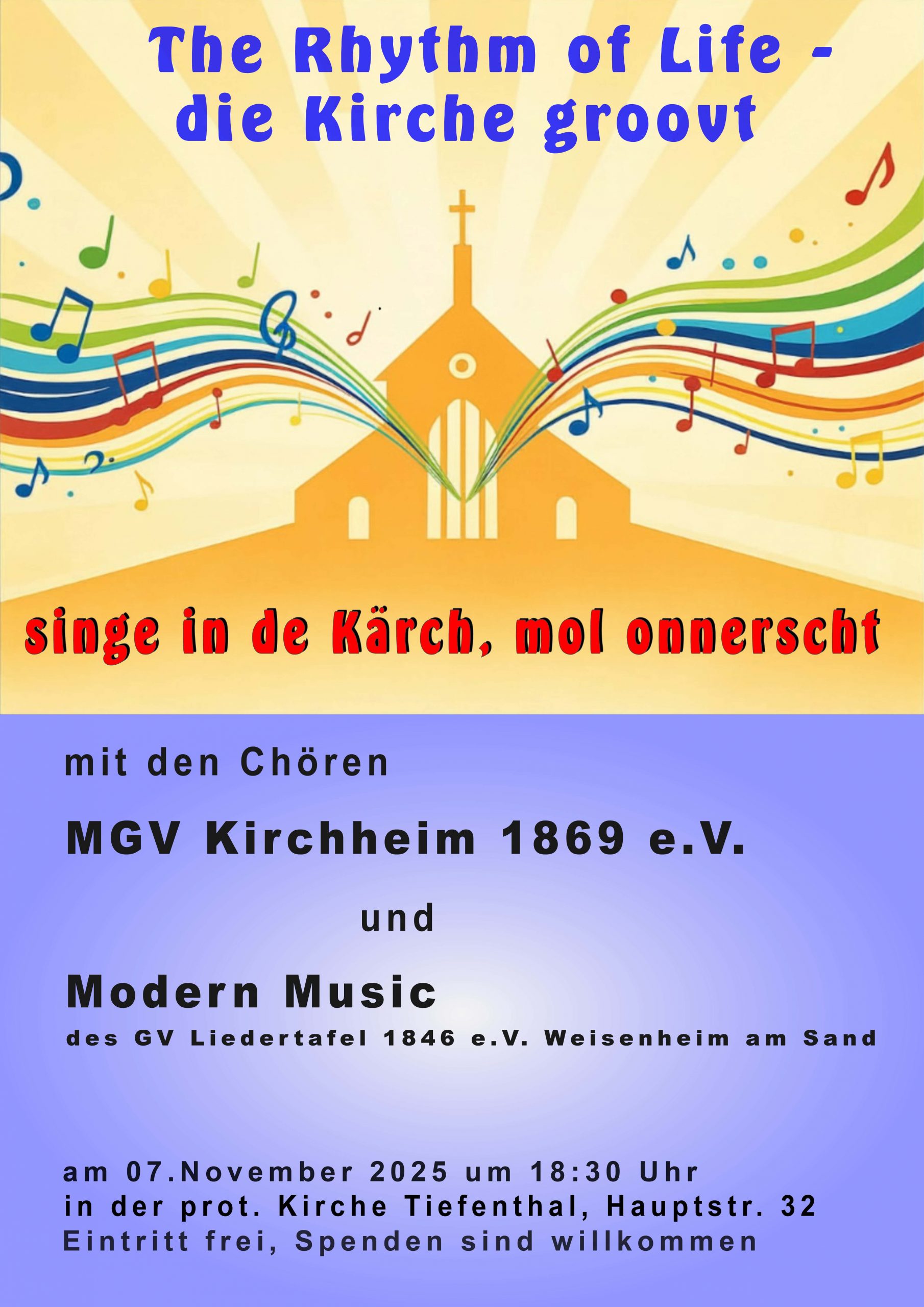The Rhythm of Life – die Kirche groovt! Karte nicht verfügbar Datum/Zeit Datum 07.11.2025 Uhrzeit 18:30 Kategorien